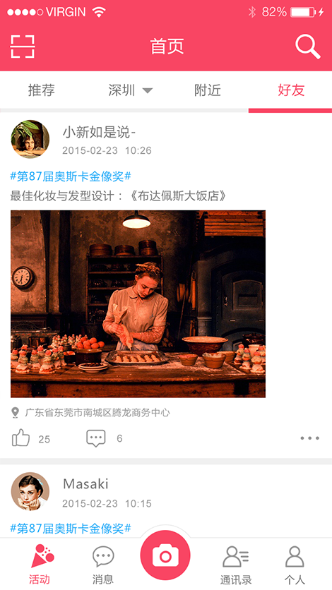 顯示好友發(fā)布的活動資訊,包括發(fā)布者的頭像呢稱、發(fā)布時間、發(fā)布內(nèi)容、發(fā)布位置定位,選擇點贊或評論