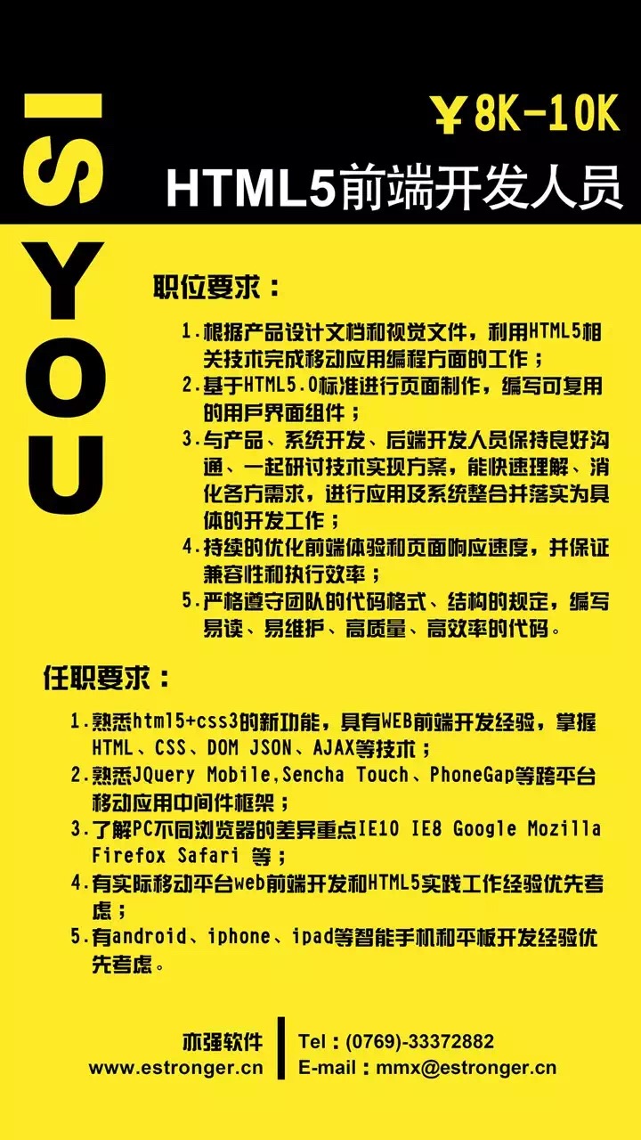 > [招聘]亦強軟件研發(fā)中心:HTML5前端開發(fā)人員