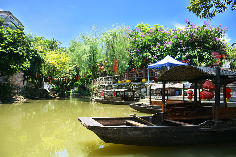 下車,跟著領(lǐng)隊(duì)穿過街巷,來到明遠(yuǎn)橋。水光接天,碧波蕩漾,曲折迂回有不盡之感覺。遠(yuǎn)離繁囂,空氣清新宜人,自然環(huán)境和諧,嶺南古村格局猶存。沿著河岸兩旁走著,古屋有百余間,古樹遍布,石板古道縱橫。綠樹成蔭、鳥語花香,一派詩情畫意。